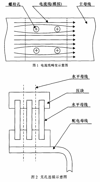 現(xiàn)在,低壓成套開關(guān)設(shè)備母線槽體系的聯(lián)接首要是運(yùn)用螺栓聯(lián)接。螺栓聯(lián)接在小電流、母線槽數(shù)量不多的情況下具有緊湊、牢靠、便當(dāng)?shù)忍卣?而跟著用電設(shè)備的增加,開關(guān)柜的容量越來越大,用螺栓聯(lián)接的缺點(diǎn)也日益顯露出來:由于需求在母線槽上鉆螺栓孔,構(gòu)成母線槽截面不同,必然引起母線槽電流流線的畸變,如圖1所示。所以要求螺栓用孔盡可能的小以盡量減小對電流的影響,但是在配電房里進(jìn)行拼柜的過程中不可避免的存在累積公役,開關(guān)柜的數(shù)量越多累積公役越大,往往構(gòu)成配電母線槽和主母線槽的螺栓孔產(chǎn)生錯(cuò)位。為了處理螺栓孔錯(cuò)位問題,大都情況下是選用沖橢圓形孔或沖大孔。這就存在對立:螺栓孔開大了,嚴(yán)重影響母排載流量,螺栓孔開小了,設(shè)備不便當(dāng)。研討新的聯(lián)接辦法成了開關(guān)柜制造商的重視的焦點(diǎn),無孔聯(lián)接這種新技能逐漸成為規(guī)劃人員研討的方針,而且取得必定的成功?,F(xiàn)在已有多家廠家研討出辦法各異的的無孔聯(lián)接技能。筆者也于2001年初步對無孔聯(lián)接技能進(jìn)行研討,并規(guī)劃出另一種與眾不同的無孔聯(lián)接辦法,經(jīng)過產(chǎn)品試制和試驗(yàn),證明這種聯(lián)接辦法是卓有成效的。