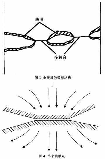 要知道在母線槽聯(lián)接處的電阻,除了母線槽自身存在的電阻外,還存在一個(gè)觸摸電阻。這是由于:不論母線槽外表處理得怎樣潤滑平坦,在微觀環(huán)境下,母線槽外表也是高低不平的,如圖3所示,兩片母線槽之間的搭接實(shí)踐上只需母線槽外表上許多小尖峰之間的觸摸,電流流過搭接面的實(shí)踐面積減少了,電流線產(chǎn)生嚴(yán)峻的縮短現(xiàn)象,產(chǎn)生縮短電阻R,取其中一點(diǎn)分析其結(jié)構(gòu)如圖4所示。另一方面,母線槽從加工結(jié)束到裝在開關(guān)柜里有必定的時(shí)間差,很簡單由于暴露在空氣里而構(gòu)成一層薄膜(如氧化膜等),使電阻增大,稱為膜電阻R,。所以觸摸電阻實(shí)踐上是由這兩部分組成,即