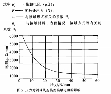 由公式(2)可知,影響母線槽搭接面觸摸電阻的首要要素有外表的條件K、m和所施加的壓力F。當(dāng)母線槽外表處理和觸摸面積確認(rèn)了,則Kj、m也確認(rèn)了,于是觸摸電阻Rj與壓力F成為反比聯(lián)絡(luò),壓力F越大,觸摸電阻Rj越小。圖5是壓力對兩片銅導(dǎo)體聯(lián)接處觸摸電阻的影響曲線圖。