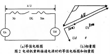 圖1所示為母線槽系統(tǒng)的某一段接線圖,圖2為電動機切換時的等值電路圖。圖中Us-電源電壓;Ud-母線槽上電動機的殘壓;Xs-電源等值電抗;Xm-母線槽上電動機組和低壓負載的等值電抗(折算到高壓母線槽壓);AU-電源電壓與殘壓之間的差拍電壓。